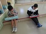 1・2年生は体育館で、マット運動をしていました。前まわりや後ろまわりの練習をがんばっていました。2年生は、どちらも連続でできましたが、1年生は、後ろまわりが難しいようでした。それでも何回も何回も練習を続けていました。マットをマットの下に敷いて坂道を作って練習をしました。「両掌を耳の横に置いて、しっかりマットにつくように」「おしりを最初に付ける位置を足の近くにして」等のアドバイスを聞いて、練習していると、すっとまわることができました。次は下に敷いたマットなしでも挑戦しましたが、コツをつかみ、くるっとまわることができました。一人一枚のマットで何回も何回も練習して、すばらしかったです。後ろまわりができて、おめでとう! 達成感のある笑顔が素敵でした。
