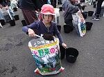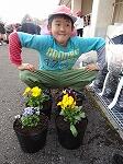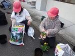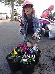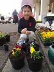みんなが集まると、飯干先生から上からの説明や諸注意がありました。その後、早速、作業に取り掛かりました。まず、一人一袋の土、大きな黒ポットと底網が4個ずつ配られました。黒ポットに底網を入れ、それに半分ぐらい土を入れていきました。次にパンジーとビオラの苗を2つずつ持ってきて、ポットの中央に置き、その周りに土を入れていきました。簡単なようですが、ショベルでポットの半分まで土を入れるのにも苦労をしている子が多かったです。