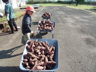1、2年生が生活科で育てていたサツマイモを収穫しました。マルチを取ったうねの土はやわらかく、手で掘り進めます。すると、すぐにあちらこちらから「あった!」の歓声、するとすぐに、「大きい!」「でっかい!」の大歓声。見ると顔より大きなサツマイモが次々と掘り出されます。みんな重そうなお芋をうれしそうな表情で運んでいます。一輪車に3台分の大豊作で、みんな大満足のいもほりでした。さて、家に持ち帰って、そんな料理になるのでしょうか。