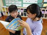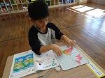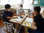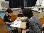 1年生は国語で、「自動車くらべ」の学習でした。教科書に出ているクレーン車について別の本でも調べ、クレーン車の「しごと」と「つくり」について表にまとめていました。2年生も国語で、「おもちゃの作り方をせつめいしよう」の学習でした。自分で作った「パッチンジャンプ」というおもちゃについて、その作り方をほかの人にも分かるように文章でまとめていました。先生にあれこれ質問されながらそれに答え、説明の文章をより分かりやすくしていました。