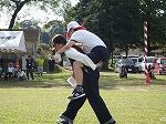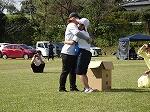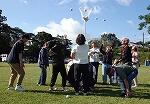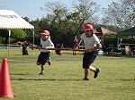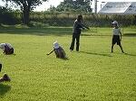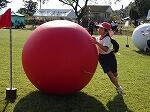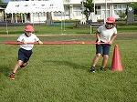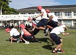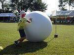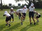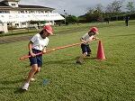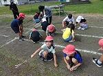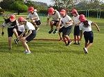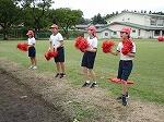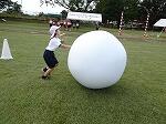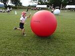 次に団技をしました。5・6年生はかなりの接戦でした。2人組でのカラーコーンの周り方、竹を全員で飛ぶタイミングなどわずかの差で順位が入れ替わりました。最後は白団が逃げ切りました。1~4年生は、体よりも大きな赤白の玉を転がします。こちらもカラーコーンを回るところがポイントのようです。こちらは赤団が勝ちました。