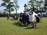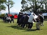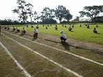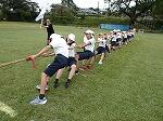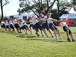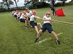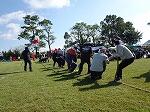 全校団技の綱引きは、1回戦は赤団、2回戦は白団、3回戦も白団が勝ちました。3回戦は団長のじゃんけんによって、どちらから先に引くか、場所をどちらにするかが決まります。掛け声をかけて腰を低くすることも勝負を分けそうです。今日は、白団の勝ちでした。