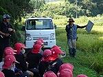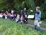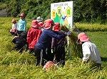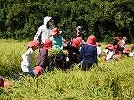10月2日(木)の午後、稲刈りをしました。晴天に恵まれましたが、先週の雨や倒れている稲の関係で計画通りとはいきませんでした。それでも保護者の皆様、地域の皆様のご協力のもと、たくさんの稲を刈り取ることができました。初めの会の後、早速4か月前に田植えをした「元気田」に移動しました。そこで、段さんの方から稲の刈り方についてレクチャーをしていただきました。
