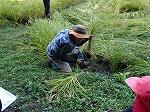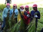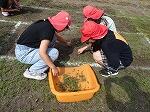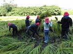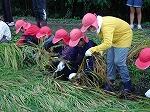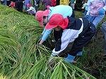 そして、早速刈り始めました。下の方をしっかり束ねて根元を切っていきます。保護者や地域の方は一発で刈っていきますが、力がいるため数回にかけて切る子が多かったです。それでもコツをつかみ、だんだん楽しくなってくる様子がうかがえました。