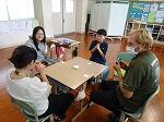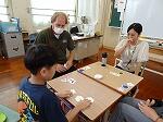 10月9日(木)です。あおぞら学級は外国語で、カードでゲームをしていました。そのカードは、形もいろいろで、いろんな色、いろんな種類の絵が載っています。手持ちの3枚のカードから1枚置いて1枚引きます。3枚が同じ種類になればオッケーです。3枚のうち1枚をほかの人に見せて、何の種類が揃ったかを言ってもらいます。その種類があっていればポイントがもらえます。もちろんカードは英語です。ペリー先生も英語でいろいろと指示を出していました。楽しみながら英語を使う姿が見られました。