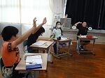 赤団は、体育館での練習でした。同じように新しい応援を考えており、団長・副団長・リーダーが前でやってみせて、それを見ながら1~4年生も覚えていました。難しい動きもあり、後半は、マン・ツー・マンで手取り足取り教える姿が見られました。