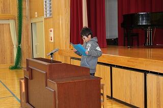 作文発表では、2学期頑張ったことや3学期頑張りたいことを、二人ともに、堂々と発表できました。校長の話では、2学期たくさんの行事を一人一人の力を出し合って成功させてきたことや冬休み中は決まりを守って、楽しく安全に過ごすことを話しました。