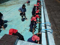 休憩をはさんで、最後の練習です。1・2年生は、宝探しで楽しみましたプールに沈んだいろいろな形のゴムやボールを潜って拾い集めます。それをかごに入れるというものです。サービスで、かごに入ったものを再度、先生がプールに投げ入れたために長い時間、楽しむことができました。3~6年生は、自由練習の時間になりました。それぞれ楽しそうに泳いだりもぐったりしていました。