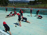 7月10日(水)の2・3校時に、全校児童でプール納めを行いました。時折、雨が降って中断しましたが、何とか水泳の授業のまとめができました。