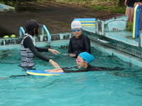 その後、ビート版を使ってバタ足の練習をしたり、体の力を抜いて仰向けに水に浮いたりしていきました。子どもたちは、先生方の話をよく聞き、楽しみながらもしっかり練習をしていました。