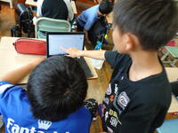 今日の1時間目、1年生は国語でした。自分の好きなことについて、ノートにメモする学習です。「てれびをみること」「さかなをつること」などしっかり書けていました。ひらがなもばっちり覚えてきています。2年生はパソコン室などで見つけたものを、どんなものか「メモ」をしてきて、それをもとに1つ1つ文章化して付箋に書いていきました。実際に見つけたものだったので、文章にするのもしやすかったようです。
