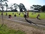 続いて「徒走」の練習をしました。プラグロム通り、1~3年生と4~6年生に分かれて行いました。「ようい」で停止できずにちょっとフライイング気味の児童いたり、あごひもは付けているもののゴールでは帽子がとれてしまって黒団になってしまう子がいたりしました。本番までにはきちんとできるよう声掛けや練習をしていきます。徒走自体は、みんな一生懸命走ってデッドヒートが繰り広げられていました。