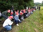 その後、全員で田んぼに入り、稲刈りをしました。一束(二束)ずつまとめて持って根元から刈っていきます。力強く一発で刈る子、のこぎりのようにぎこぎこ刈る子等、いろいろでしたが、とっても楽しんでいる様子がうかがえました。
