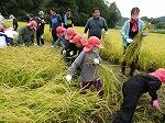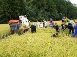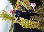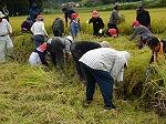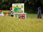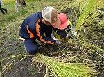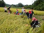 中にはお父さんがお子さんに刈り方を丁寧に教えている場面も見られました。地域の方は、さすがに手慣れたもので、どんどんと鎌で刈ってくださりお手本を示してくださいました。並行してコンバインも登場し半分ほどをあっと間に刈ってくださいました。