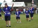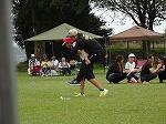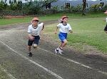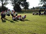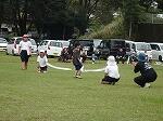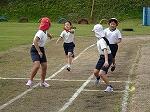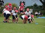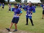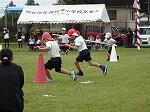 プログラム2は4~6年生の団技「風よ!舞い上がれ」でした。長い棒を2人でもって、3つのカラーコーンをまわって帰ってきます。帰ってきたら棒を団のみんなの足元を通しリターンして頭上を通して次の人に棒を渡します。それを2周繰り返し、勝敗を決します。これまたいい勝負が続き、最後までどちらが勝つか分かりませんでした。結局、途中からじわじわとリードを広げた赤団の勝利でした。