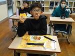 6年生は、今日はお弁当です。久場先生が、「給食とお弁当どっちがいい」と尋ねると、全員が「お弁当」と答えていました。給食ももりもり食べる6年生ですが、おうちの方の手作り弁当には勝てないようですね。たまに食べるからいいのかもしれませんが。いただきますの後、久場先生のお弁当に興味津々の6年生。まずは観察して、自分のお弁当を食べ始めました。