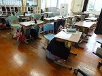 2時間目が終わると、突然、放送から「訓練です。訓練です。ただいま大きな揺れが発生しました。急いで姿勢を低くして、机などの下に入ってじっとしてください。」という教頭先生の声が聞こえてきました。子どもたちは落ち着いてさっと机にの下にもぐりました。臨場感あるれる音が流れる中、机の脚をしっかり押さえて体・頭を守っていました。