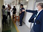 不審者役の警察官は、正門から入り二次側の非常階段をのぼって6年生教室に入ろうとしました。ここで勇敢に立ち向かったのが、久場先生です。子どもたちを守るために侵入を阻止しようと懸命に説得を試みます。それでも、刃物(にせもの)をふりまわしたりいかくする不審者役は強引に入ろうとします。その間に6年生は5年教室に避難し、施錠をして静かに待機しました。その後駆けつけた先生方の協力もあり、無事、不審者役は確保されました。
