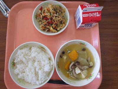 ・ごはん ・千切り大根のイリチー ・カボチャの味噌汁 ・牛乳