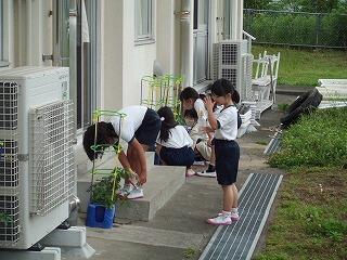 朝の1,2・3年生教室の前の光景です。登校後、自分のランドセルの荷物を収納した後、教室外の一人一鉢に水やりをしっかりしています。1年生はアサガオ、2・3年生はミニトマトやホウセンカを育てていますが、「葉っぱが出てきた」「花が見えてきた」など小さな生長を喜ぶ声もよく聞かれます。これも毎日見ているからこその声なのでしょうね。