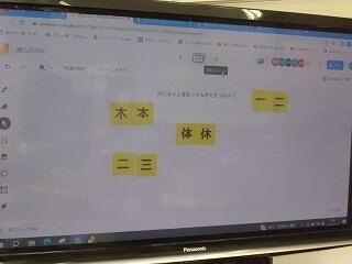 2年生が国語でタブレット使っていました。今回は同じような形の漢字を集める学習で「木・林・森」や「休・体」、「雨・雪」から「同・回」等おもしろい発想の漢字の仲間もつくっていました。また、今回はグーグルジャムボードの付箋機能を使って自分の考えた漢字の仲間を作成し、共有の画面上で持ち寄って確認していました。自分の画面が紹介されて照れている姿も見られました。