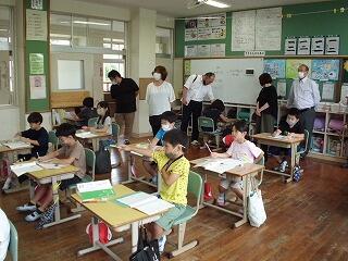 5月30日(火)に本年度第1回目の学校運営協議会を開催しました。運営協議員のみなさんに委嘱状を交付し、校長の学校経営方針の説明や年間の行事等の確認を行いました。また、授業の様子も見ていただきましたが、理科で水の流れを動画で撮影している様子やALTと5,6年生の受け応えをみて、「今の子どもたちは幸せですね。」との感想も聞かれました。