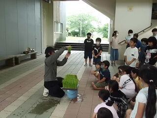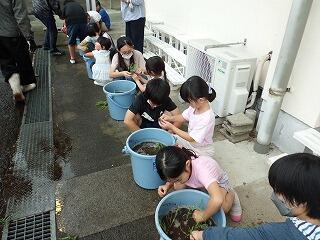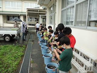 6月1日の田植えは、悪天候のため、急遽、バケツに稲を植える活動へ変更しました。地域の方に苗の植え方のコツを教えていただき、高学年児童と低学年児童がペアになって作業を進めました。みんな話にあった3から5本を数えながら丁寧に植えていたようです。しっかり育つと一粒が500粒になるという話もしました。しっかりお世話をして、ずっしりと頭を垂れる稲穂に育つといいですね。