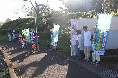 高崎地区一斉あいさつ運動が8月27日の2学期の始業日に合わせて、各学校前で行われました。縄瀬小学校正門前にも40名近くの地域の皆様方が 集まり、子どもたちにあいさつの声をかけ登校を見守っていただきました。