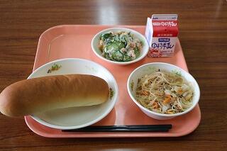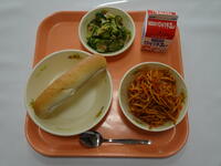 減量米粉パン、ポロネーゼスパゲティ、胡麻ドレッシングサラダ、牛乳