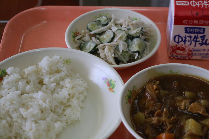 ~むぎごはん、かみかみサラダ、ポークカレー、牛乳~