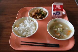 ごはん・鶏肉と大豆のあまから揚げ・豆腐の味噌汁・牛乳