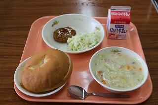 バーガーパン・照り焼きパティ・キャベツ・クリームスープ・牛乳