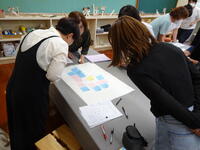 事前のアンケートで集約した「縄瀬っ子がこうなったらいいな。」の一覧から班ごとにテーマを選び、そのテーマについての縄瀬っ子の現状や課題について、赤の付箋に各自書いていきました。それを一人一人説明をしながら模造紙に貼っていきました。似た内容のものをフルーピングし、実態を浮かび上がらせました。次に、それらの課題に対して自分だったらこんなことができそうだというものを蒼の付箋に書いて同様に説明しながら模造紙に貼っていきました。