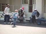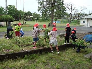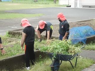 4年生が花壇の整備を行っていました。春先に目を楽しませてくれた花もしぼみ、夏の花や野菜の栽培に向けて、まずは除草作業です。みんな一生懸命作業をし、あっという間に一輪車が草いっぱいになり、子どもたちも協力して何度も草捨て場へ運んでいました。どんな学級園になるか、これからが楽しみですね。