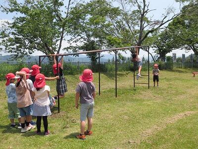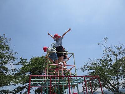 運動場にあるジャングルジムと雲梯が一体化したものが、劣化と接合部分でのけがの危険性があるということで、使用停止の状態が続いていました。先日、修繕と切り離して設置工事が終わり、ジャングルジムは使用できるようになりました。後日、基礎が固まった雲梯も使用できるようになりました。遊べる遊具が増えて、子どもたちも昼休みに早速遊ぶ姿が見られました。