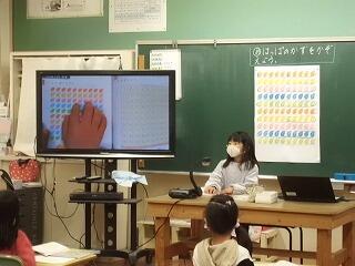 1年生の算数の時間です。画面に映し出された図を指さしながら自分の考えを発表しています。図のどこを説明しているのか指さす様子も拡大して画面に映し出されます。みんなの方を見ながら発表をする練習です。このような活動を繰り返していくことでみんなの前で表現する力の基礎がつくられていくのでしょうね。これからもがんばりましょう。