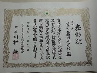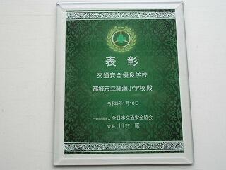 去る1月17日、18日に東京で開催された交通安全国民運動中央大会において、縄瀬小学校が「交通安全優良学校」として表彰されました。これは全国の小、中、高校の中から交通安全教育活動の積極的な推進や児童の交通安全教育と交通事故防止に顕著な功績のあった学校45校(県内で1校)に選出されたものです。これまで受け継がれてきた自転車競技大会への参加や保護者、地域を挙げての日々の交通安全見守りが評価されたものだと思います。日頃から御尽力をいただいている皆様の御協力に感謝いたします。
