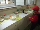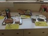 保健室前に児童が集まっています。ここには、昭和20年頃から現在までの給食サンプルが並べてあります。初めて見る1年生は、「ご飯はないの?」「おかずもない」と驚いた様子でした。残食もほとんど無く、しっかり食べている縄瀬っ子、毎日おいしい給食がいただけること、それに携わってくださっている方々に感謝ですね。