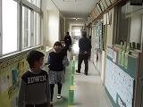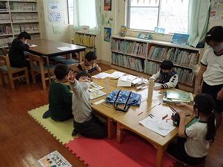 3,4年生が外国語活動の時間、3人組で校内を回っています。部屋に入るときには、この日のキーセンテンスである「This is my favorite place.the〇〇.」と言っています。みんなでしっかり言えたら、その部屋にあるカードを取り、そのカードに書いてある次の目的地へ移動していました。どの班も各部屋へ入る前に言葉の確認をしながら臨んでいました。
