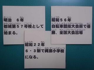 来年の創立150周年に向けて昨年度から通算で第6回となるプロジェクト委員が2月8日に実施されました。「記念式典部会」、「記念品部会」、「記念誌部会」の3部会で進捗状況を確認しながら会合が重ねられています。仕事の後の時間ですが熱心な議論に感謝の気持ちで一杯です。また、校長室前も学校の歴史をカードにして、それをパネルにはって設置する準備を進めています。カードを作成しながら、これまでの縄瀬小学校の子どもたちの活躍や学校の変遷にふれ、当時の縄瀬小に関わる方々の姿に思いを馳せていました。学校としての節目を迎える今の子どもたちが、今後の諸行事をとおして自分の通っている学校へのさらなる愛着や誇りをもってくれればと考えています。