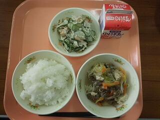・ごはん ・焼き肉炒め ・中華たまごスープ ・牛乳