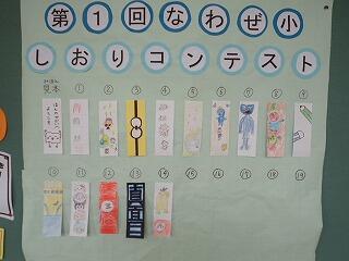 雨の日の昼休み、図書室には本を静かに読む子どもと真ん中のテーブルに集まって何か書いている子がいました。近寄ってみると、なにやら絵を描いて色を塗っています。よく見るとしおりを作っていました。図書室の入り口には「第1回なわぜ小 しおりコンテスト」のコーナーとすでに作られた作品が掲示してあります。自分だけのしおりを持つこと、これも本に親しみをもつための工夫の一つですね。