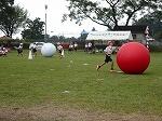 プログラム5は、1~3年生の団技「ころがせ!大きなあめ玉!」でした。低学年児童の背丈ほどもある大玉を1人で転がし、カラーコーンを回って帰ってきて、次の人に渡します。それを繰り返し競争します。赤団がリードを続けていましたが、後半だんだんと距離が縮まり、アンカーで見事逆転に成功し、そのままゴールしました。勝負はやってみないとわからないものだなあと思いました。