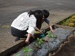 あおぞら学級は、今年、野菜栽培に挑戦します。今日は、ミニトマト、ナス、ピーマン、オクラの苗を植えていました。マルチカッターで穴をあけて、高さを調整して苗を入れます。周りの土を寄せてぐらつかないようにしました。次に支柱を立てて、八の字に結びます。やり方を教えると器用に結んでいました。最後に水を根元にかけました。これからもお世話を続けて収穫まで頑張ってほしいです。