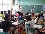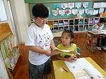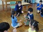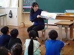 1~4年生には、「大きさくらべ」や「ありとスイカ」の本の読み聞かせや「あんたがたどこさ」の手遊びなどを教えてくださいました。お話も楽しく子どもたちは集中して聞いていました。手遊びは「歌を知らない」といいながらも、手拍子をしながら「さ」の部分で右の手のひらで相手の左の手のひらをたたくルール通りに、リズムよく楽しんでいました。