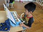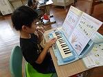 1・2年生は音楽で、「どんぐりさんのおうち」を学習していました。ドレミとなかよくなろうということで、どんぐりさん(ド)、レモンさん(レ)、みかんさん(ミ)が二つのお山のどこにあるのかを歌を歌いながら確かめ、その後、鍵盤ハーモニカで歌に合わせて「ド」「レ」「ミ」の音を鳴らしていました。とても楽しそうでした。