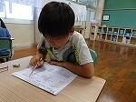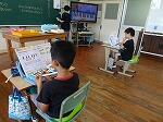 1年生は国語で、「おむすびころりん」のお話に合わせての動きを動画に撮ったのを自分で見返していました。その後、Qubenaで小さい「や」「ゆ」「よ」についてなぞり書きなどをしていました。2年生も国語の「夏がいっぱい」の学習で、夏らしい「そうめん」を選んで作文に書いていました。家族で冷たいそうめんを食べた思い出を文に書き、その上に絵を描きました。
