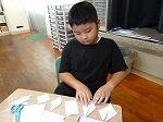 5年生は算数で、「四角形の対角線を切ると合同か」という問題にチャレンジしていました。実際に、神に書かれた正方形、長方形、平行四辺形、台形等の四角形を切り取ります。さらに、その図形の対角線を切ります。2つの三角形に分かれますが、さて合同でしょうか?ぴったり重なる図形もあり、驚きの声が上がっていました。