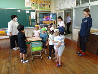 7月2日(水)の昼休み時間に、縄瀬保育園の年長さん、年中さんが先生2人に連れられて、縄瀬小学校に来てくれました。目的は、昨年度に卒園して、現在1年生の橋本伸希さんに、保育園の夏祭りの招待状を届けることでした。伸希さんは久しぶりに会う先生は後輩たちにちょっと照れた感じでしたが、お兄ちゃんになったぞという雰囲気を醸し出していました。保育園生も学校を珍しそうに眺めていました。帰りは運動場を突っ切ってすぐです。今後もいろんな交流ができればと思います。