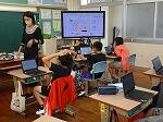 5年生はいち早く取り掛かり、特に算数の授業で活用しています。大きなホワイトボードの中に、それぞれ問題やめあて、個人の考えを書くところ等があり、そこにどんどん書き込んでいきます。広いホワイトボードの中で迷子になるのではという心配をよそに、子どもたちは操作に慣れるのが早く、すらすら進めていました。友達の考えもリアルタイムで見ることができた、他者参照しながら考えを深めていけるのもいいなあと思いました。